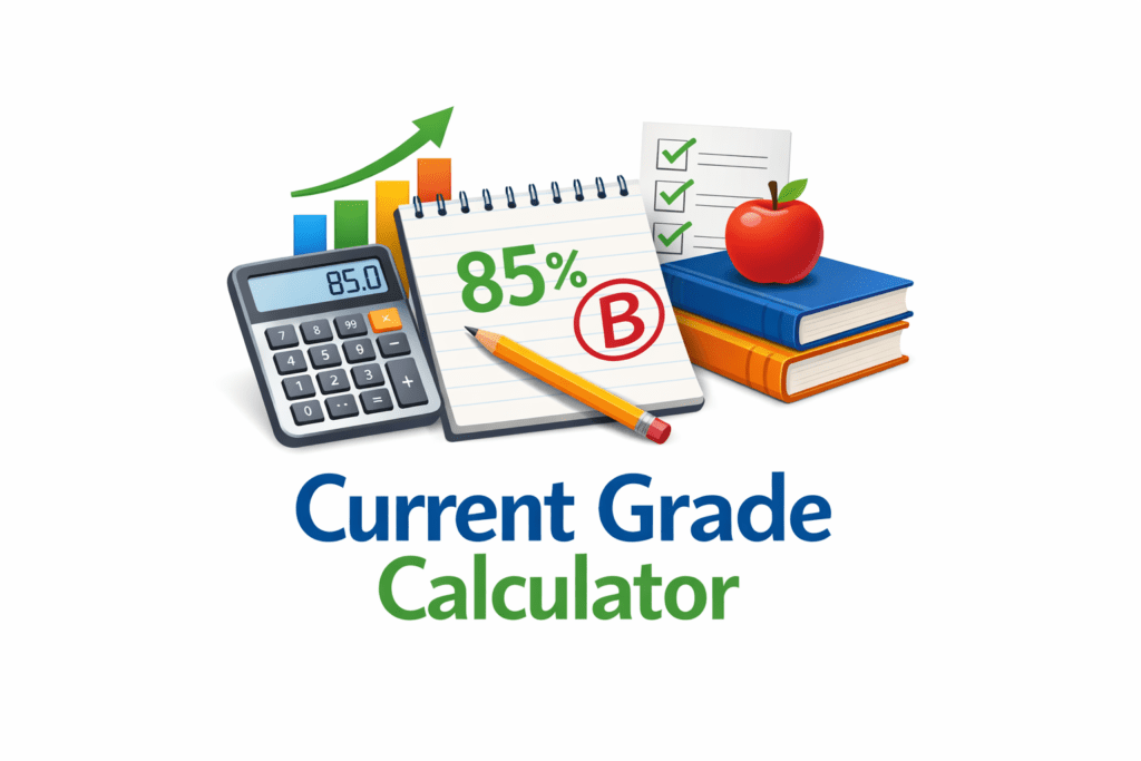 A Current Grade Calculator helps students calculate their current grade in a class based on completed assignments, quizzes, tests, and weighted categories. By entering scores and weight percentages, this grade calculator computes the weighted average and estimates the current course grade before the final exam.